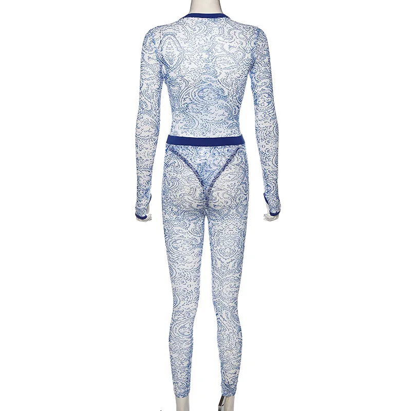 2020 Fashion New Arrival Women Rompers Womens Sexy Bodycon Blue Print 2 Piece Jumpsuit Set
