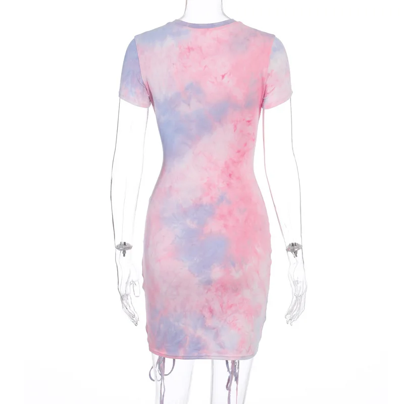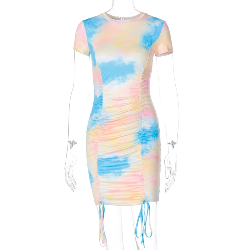 Product name | wholesale dropshipping 2021 summer new tie-dye print sexy round neck drawstring pleated club evening casual dresses for women | |